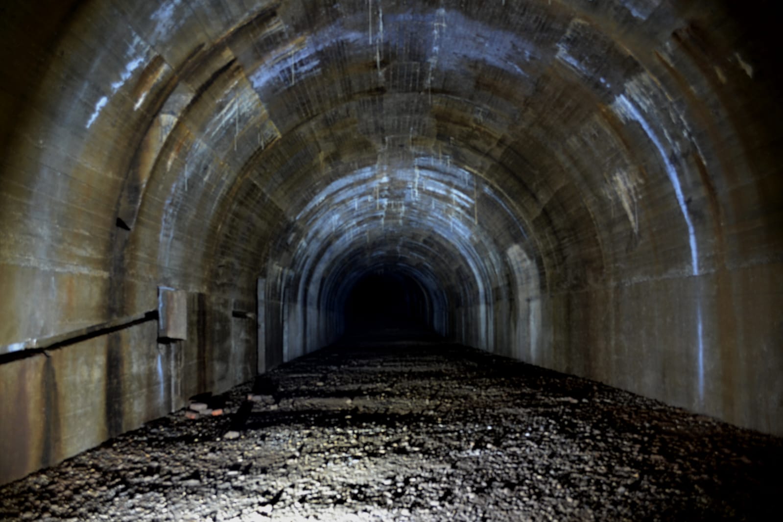 Entrati, dopo una breve discesa composta dai detriti penetrati dal foro in galleria, con stupore ci ritrovammo in un corridoio decisamente più ampio. Il caldo umido dell’interno apparve subito oppressivo. Accendemmo le torce vere e proprie e, ridacchiando per allontanare il senso di scomodità dell’inoltrarsi in un ambiente oscuro e completamente sconosciuto, superammo il primo paraschegge. Sul terreno nessuna traccia di passaggio umano recente, solo qualche piccola scovazza entrata col vento e il dilavio: superato il gomito del paraschegge il pavimento diveniva completamente pulito. All’improvviso, dopo aver superato delle radici d’albero cresciute tra le fenditure del cemento simili a tubi di rame, si palesava la galleria vera e propria. Bam! Sei metri di larghezza, 5 di altezza per chissà quanti metri. Non ce l’aspettavamo così imponente.