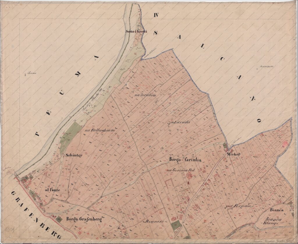 Le mappe del Catasto dei secc. XIX-XX (detto anche “franceschino”), conservate all’Archivio di Stato di Gorizia, sono il frutto di un lavoro, avviato su impulso dell’imperatore Francesco I d’Austria, che prevedeva la misurazione e la revisione delle proprietà, attraverso sopralluoghi sul territorio di ogni comune.